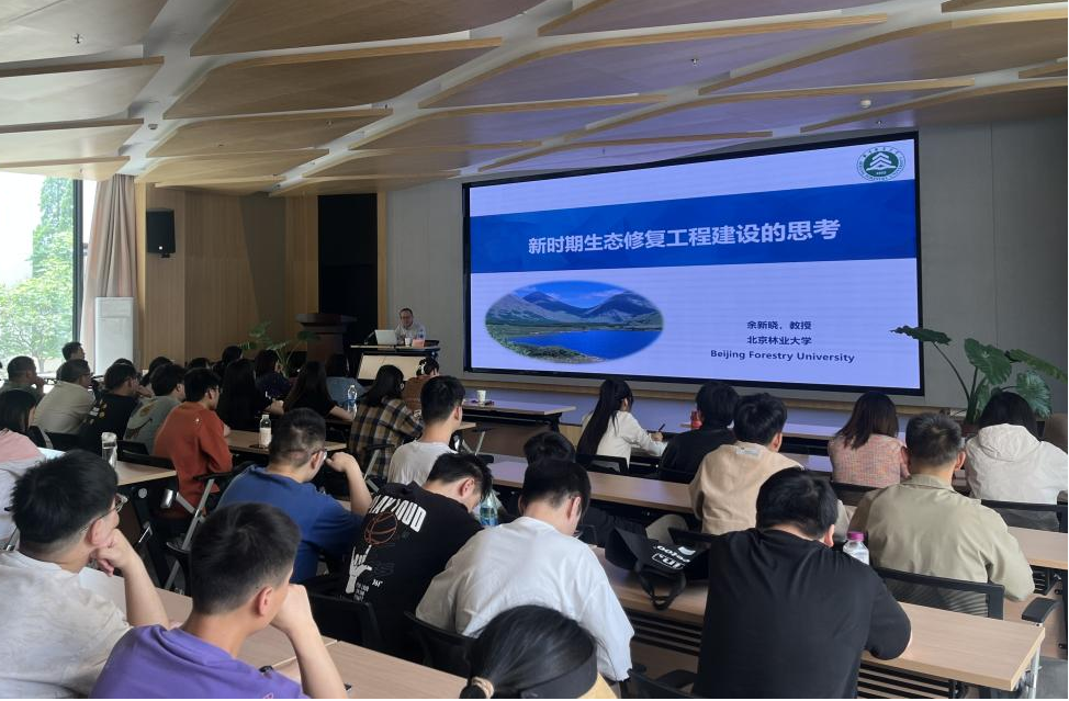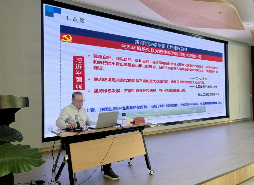 本次讲座主题是:“新时代生态修复工程建设的思考”,余教授首先讲述了新时期生态修复工程建设背景,明确了生态环境是关系党的使命宗旨的重大政治问题,应以习近平新时代中国特色社会主义思想为指导,全面贯彻落实二十大精神,针对我国生态环境质量持续好转中出现的成效不稳固问题,开展科学布局和组织实施重要生态系统保护和修复重大工程,着力提高生态系统自我修复能力,切实增强生态系统稳定性,显著提升生态系统功能全面扩大优质生态产品。
