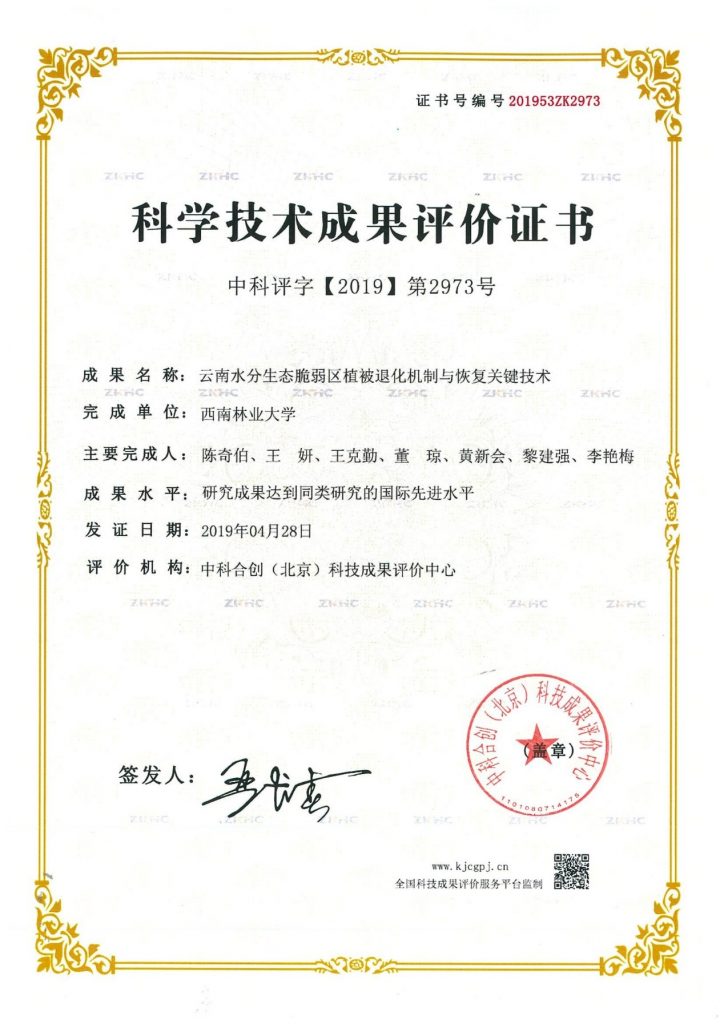 公司陈奇伯教授为本项目的第一完成人,王妍,王克勤,董琼,黄新会,黎建强,李艳梅共同参与完成。“云南水分生态脆弱区植被退化机制与恢复关键技术“项目以云南省干热河谷区、岩溶石漠化区为代表的水分生态脆弱区为研究对象,对该区植被恢复的水分约束条件、景观斑块多样性集水造林技术、以乡土树种为主的乔灌结合优势种群构建植被恢复技术、植被干扰退化区土壤种子库植被恢复技术进行了研究和推广。(1)通过对干热河谷区水土流失特征、地表径流过程、土壤入渗及土壤水分环境特征、土壤水分运动规律与水文生态特征的研究,探析了水分生态承载力及植被水分适宜性现状,揭示了该区植被恢复的水分约束机理,提出封禁管护、反坡整地和水平阶整地的土壤水分环境条件和植被恢复条件改善技术;(2)提出了干热河谷区植被恢复的分区治理思想,构建了由集水区、农林业生产区和系统隔离防护区组成的集水造林和植被恢复技术,该技术可将自然坡面自然降雨转化为土壤水分的比例从22%显著提高至83-89%;(3)遵循适地适树和人工辅助构建优势群落的方式,构建了石漠化区两种乔灌混交配置和针阔混交的乔灌草立体配置植被恢复模式;(4)通过人工干扰植被退化废弃地不同部位土壤种子库与周边地上植被群落的关系分析,提出了土壤种子库植被自然恢复和客土覆盖植被恢复模式。