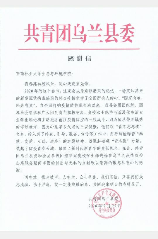 生态与环境公司水土保持与荒漠化防治的邢进梅同学主动报名前往疫情防控的一线战斗,投入到排查、引导、服务、宣传等工作中,彰显了新时代青年的责任担当,为此,共青团乌兰县委发来感谢信。