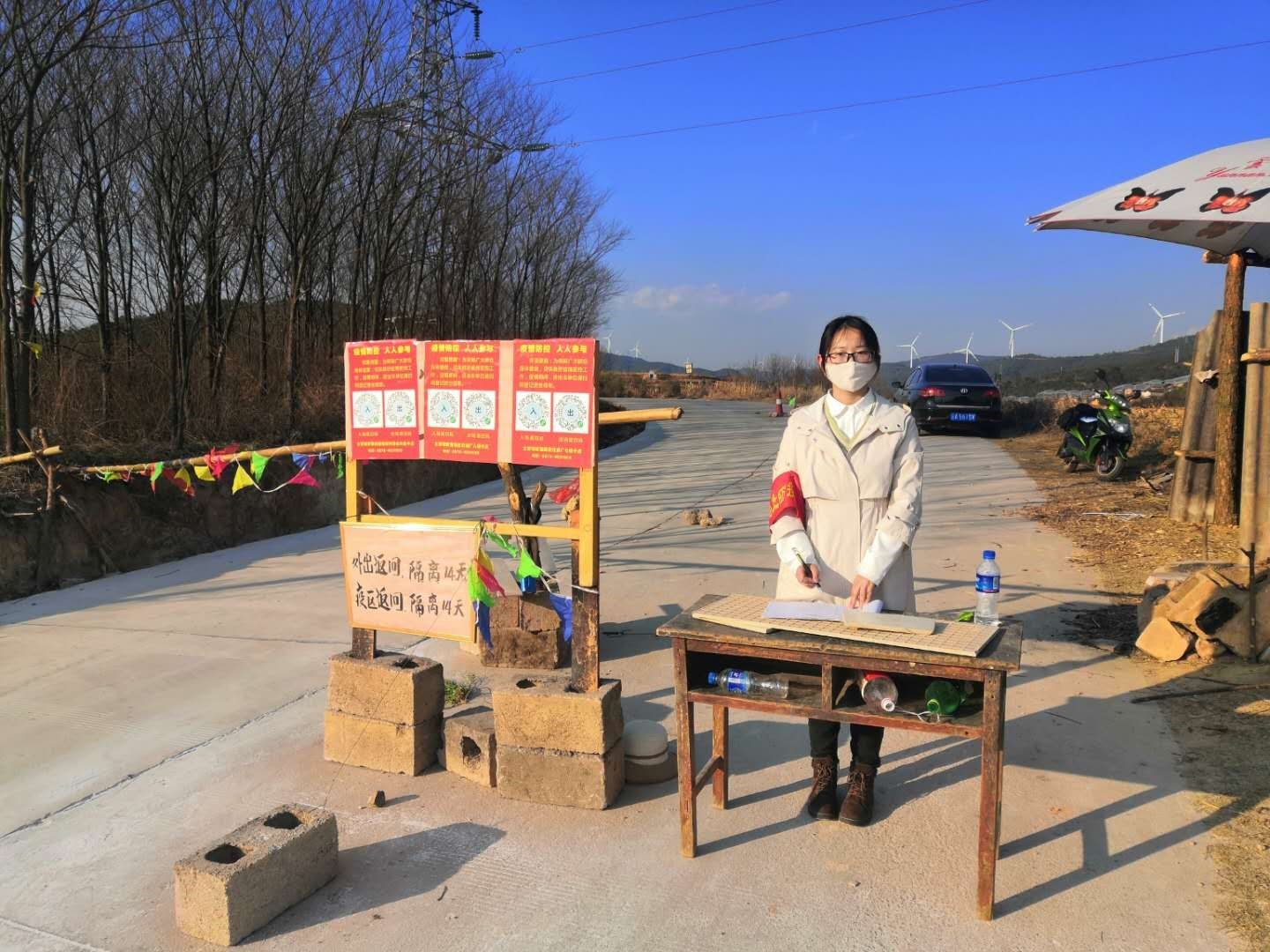 生态与环境公司2017级环境工程专业李瑞琳同学作为一名预备党员,她积极响应号召,志愿为抗击疫情献出自己的一份力。自疫情起,她主动请愿,每日在村口值班,帮助村里在村口堵卡,填好进出村子的详细信息,告知他们需要进出签到,戴口罩,劝导外地来访者,也会定期寻访村里各户的实际情况,送出物资,给予真切的问候,不怕辛苦,不怕麻烦,只想尽自己的一份力为村民为大家多一份健康保障。