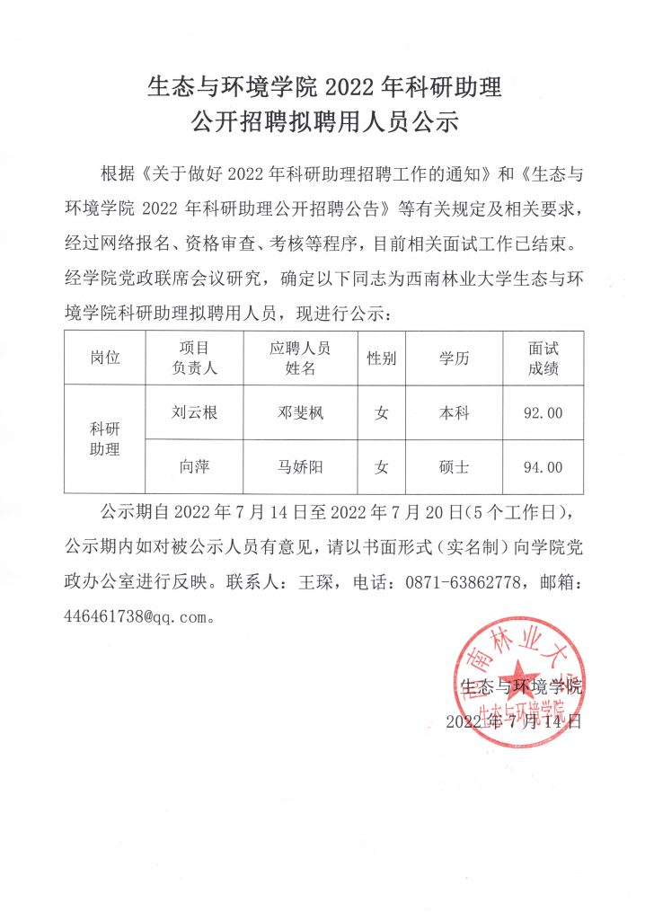 生态与环境公司2022年科研助理 公开招聘拟聘用人员公示