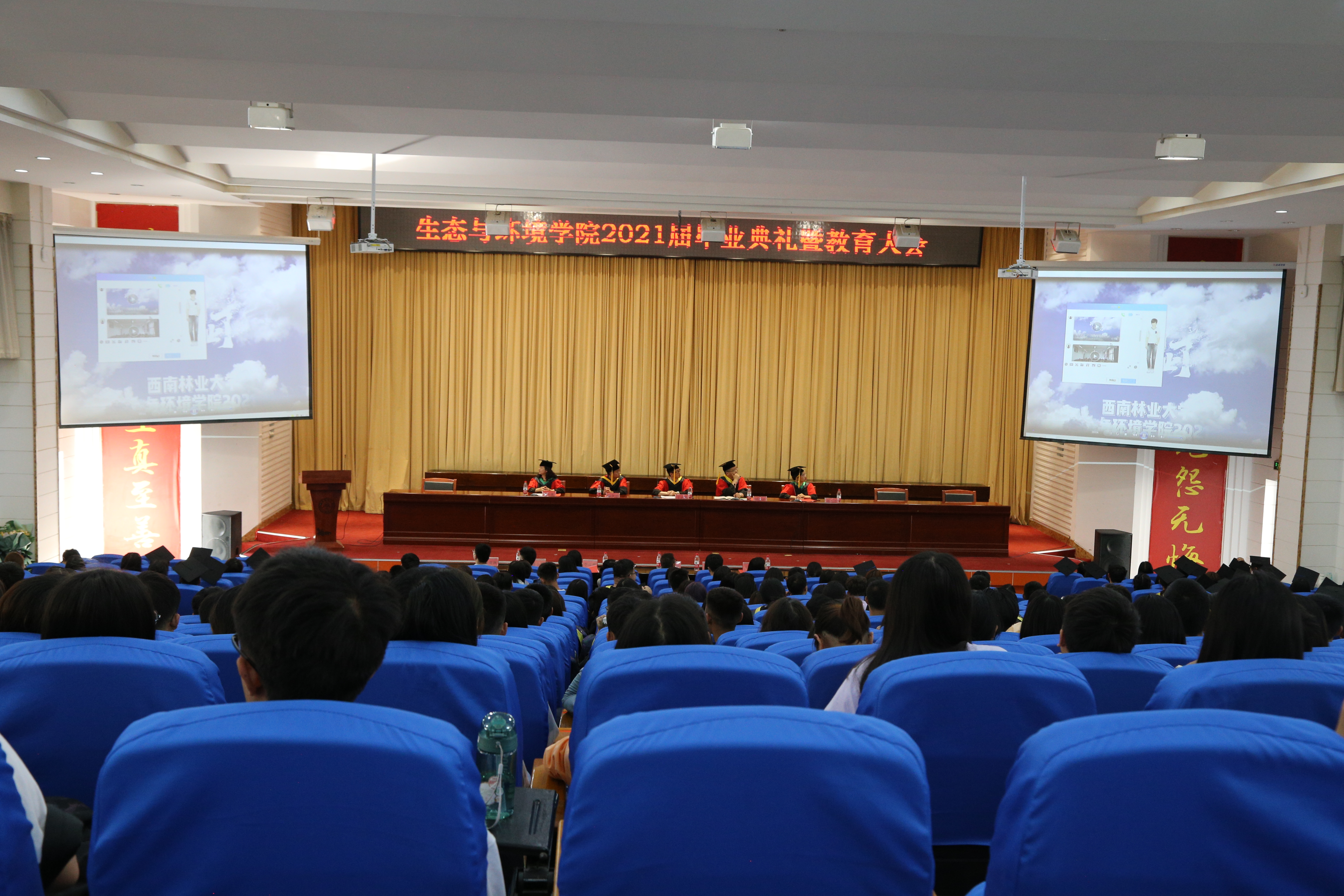 典礼开始前,播放了毕业纪念视频。一张张照片让同学们忆起四年的大学美好时光,一段段来自老师同学们的祝福视频,为2021届毕业生送去最真挚的祝愿。随后全体起立,奏唱国歌。