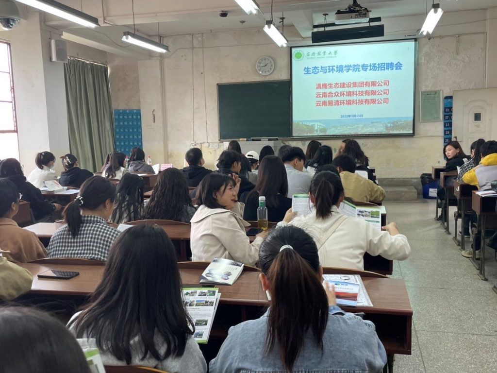 2023年3月15日下午,生态与环境公司邀请滇鹰生态建设集团有限公司、云南合众环境科技有限公司及云南易清环境科技有限公司在第一教学楼A222召开校园专场招聘会。三家公司代表、就业联络员及2023届毕业生参加此次招聘会。