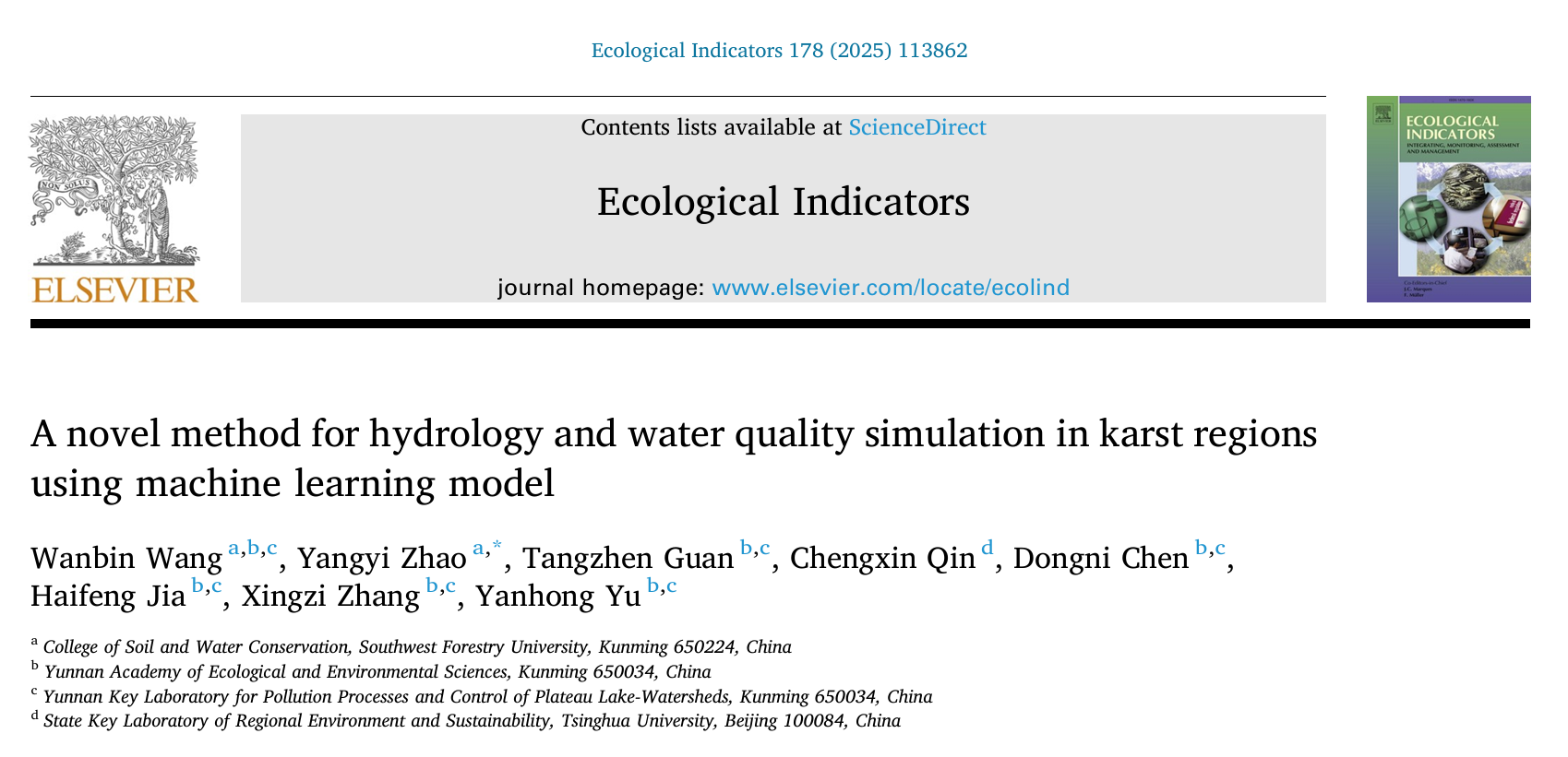 近期,公司赵洋毅研究团队在国际知名期刊Ecological Indicators(中国科公司一区TOP期刊,IF=7.4)上发表了题为 " A novel method for hydrology and water quality simulation in karst regions using machine learning model" 的研究论文。