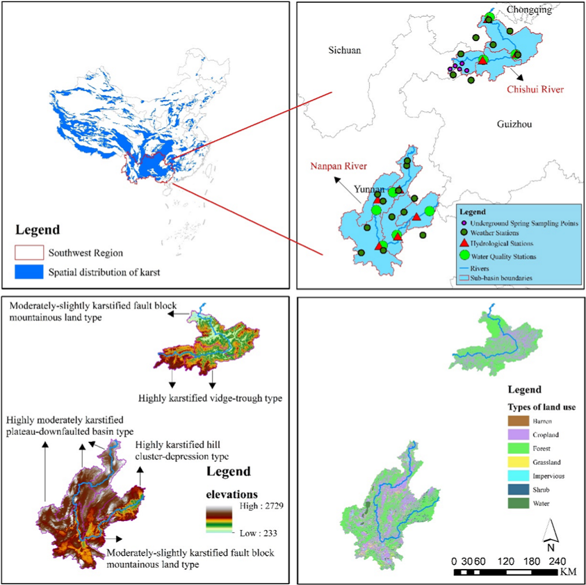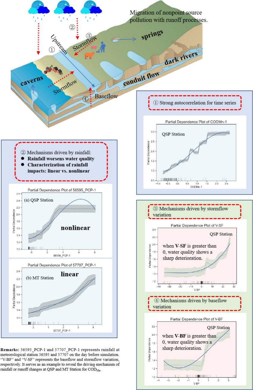 本研究以中国西南喀斯特地区的两个典型流域——赤水河与南盘江流域作为案例进行验证。研究成果表明:首先,该创新方法成功实现了对径流量、高锰酸盐指数、总氮和总磷的全面模拟预测。其次,研究发现降雨在喀斯特地区水文和水质模拟中扮演着显著的正向驱动角色,能够有效削弱这些参数固有的强自相关性。研究进一步揭示,基流与暴雨径流的增加会加剧水质恶化,这一现象在赤水河流域的高锰酸盐指数和总磷指标上表现最为突出。第三,受独特地质特征影响,垄槽谷地、裂隙盆地及裂隙山区等特定地貌单元的水质对降雨的响应更为敏感,所受影响也更显著。