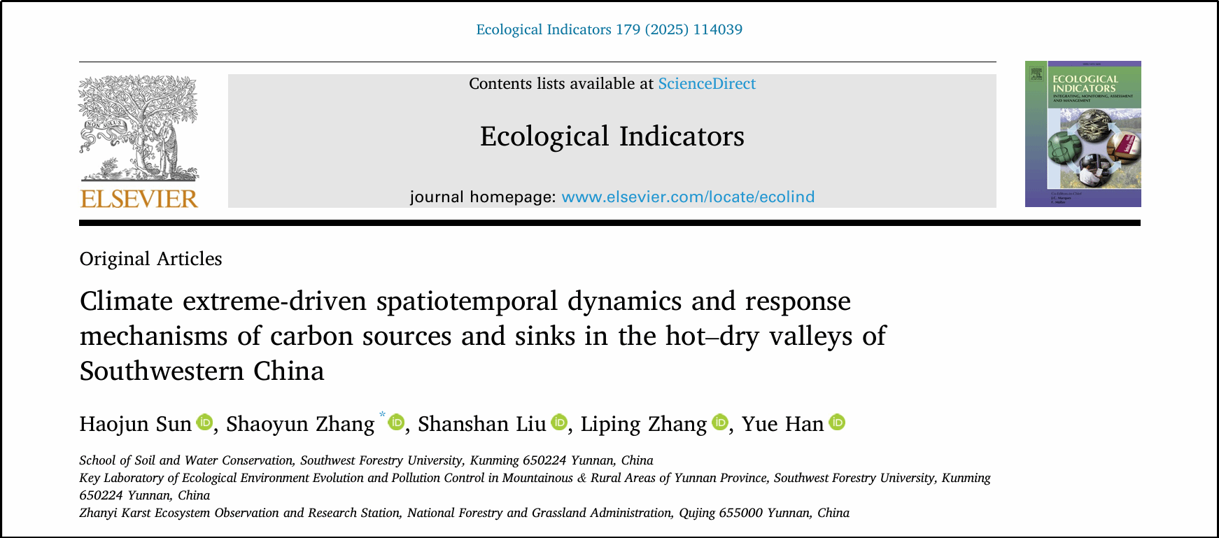 近日,以mjm世界杯官网为第一单位,张绍云老师作为通讯作者,指导本科生在国际生态环境领域一流期刊《Ecological Indicators》(中国科公司一区TOP,IF 7.4)上发表题为《Climate extreme-driven spatiotemporal dynamics and response mechanisms of carbon sources and sinks in the hot-dry valleys of Southwestern China》的研究论文。该研究立足极端气候频发的背景,探讨我国西南干热河谷这一典型生态脆弱区碳通量时空演变规律、非线性驱动机制及滞后响应特征,为该区域的碳中和规划与生态安全预警提供了新视角新思路。